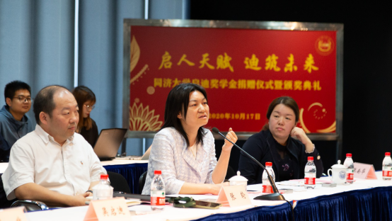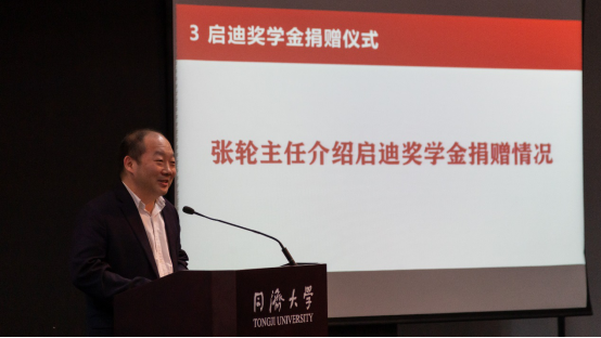 张轮教授介绍了启迪奖学金的捐赠情况。他提到,启迪奖学金自设立以来,得到国内外校友、校友基金会和企业的大力支持,前后共计39次捐资注入,共有41名优秀学子获得启迪奖学金,目前启迪奖学金奖金池中尚有5813646.01元净额人民币。随后,他再次感谢吴启迪教授以及此次为奖学金捐资的乔非教授,并邀请彭震伟教授为吴启迪校长和乔非教授颁发捐赠证书。