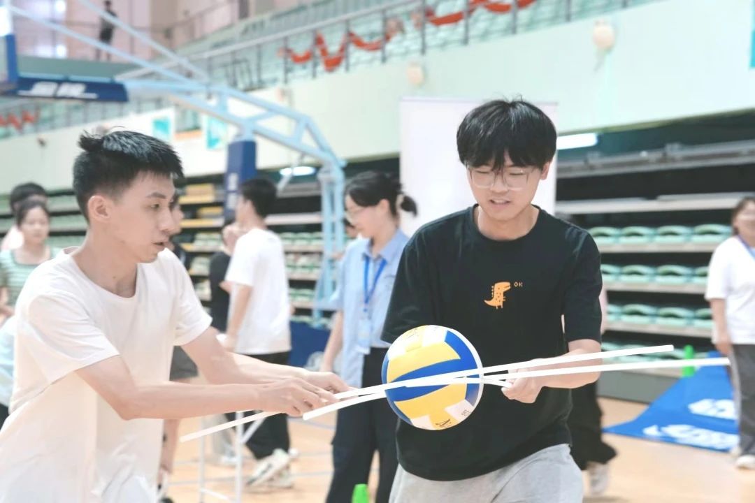 团体项目“众星拱月”精彩上演。来自437必赢会员中心、计算机科学与技术学院、国豪书院等12支代表队的精英们齐聚一堂,他们通过同心鼓颠球的巧妙配合,一边保持排球在空中弹跳,一边携手冲向终点线,充分展现了团队协作的力量与默契。